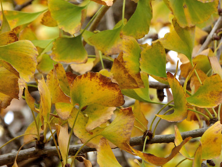 車窓からも沢山のイチョウの木が見えるのですが、まだ青いままの葉っぱ、茶色く変色してしまった葉っぱが混在してる状況です。