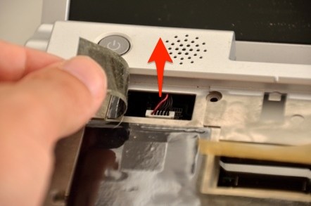 めくった時に、キーボードが基板とつながっているので、緑色の四角のシールをめくり、フラットケーブルを外す。