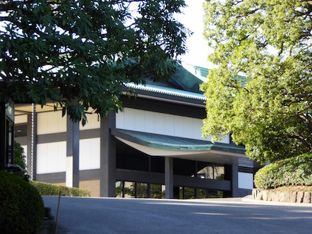 坂下門をくぐったすぐに、宮殿のエントランスがチラ見。ここで陛下が車に乗る映像を見た事があるぞ!